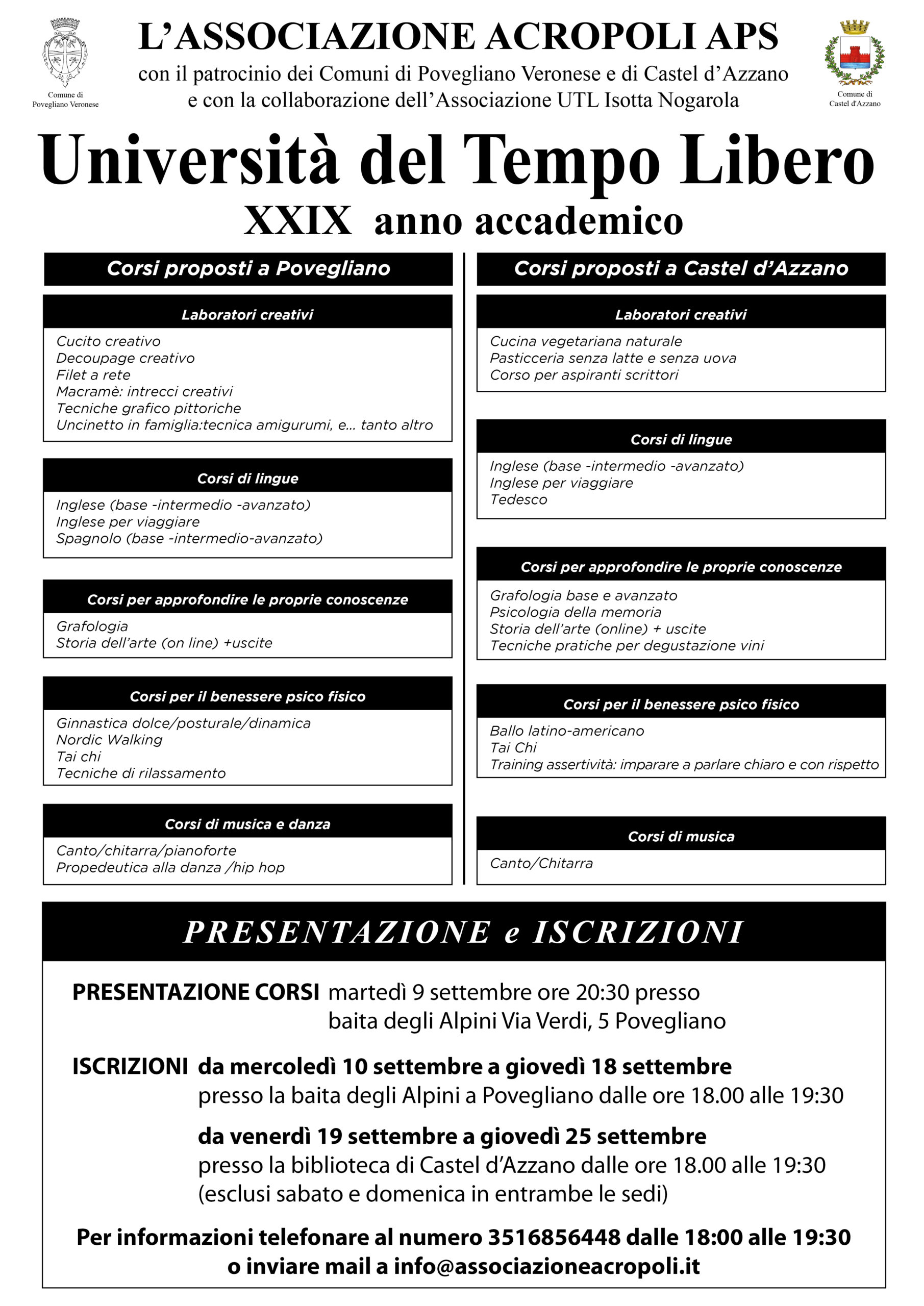 L’Associazione Acropoli APS, con il sostegno dei Comuni di Povegliano Veronese e Castel d’Azzano e la collaborazione dell’Associazione UTL Isotta Nogarola, propone anche per il 2025 un ricco calendario di corsi pensati per chi desidera imparare, coltivare le proprie passioni o semplicemente ritagliarsi del tempo di qualità.
